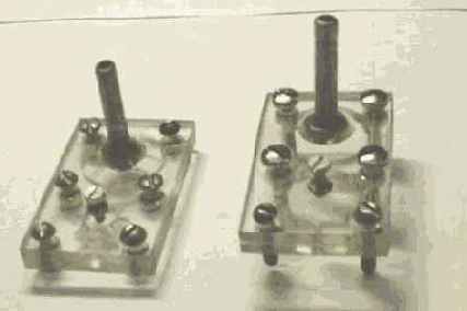 Для сверления отверстий крыльчатки и камеры компенсатора, необходимы лепестковые сверла большого диаметра, так как обычные сверла большого диаметра не дадут ровного отверстия без сверлильного станка с тисами. Лепестковые сверла можно изготовить самостоятельно из жести толщиной 2мм и шпильки с резьбой М4. На рисунке показаны такие сверла и вырезанные ими "баранки" отверстий. Хотя можно обойтись и надфилями, наждачной бумагой и терпением, сверлить лепестковым сверлом лучше, когда заготовка закреплена на деревянном бруске шурупами, это не даст поломаться заготовке на выходе отверстия.